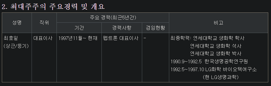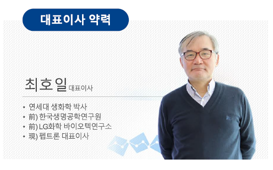 ① 회사 개요: 주식회사 펩트론은 대전광역시 유성구에 본점을 두고 있으며, 대표이사는 최호일임