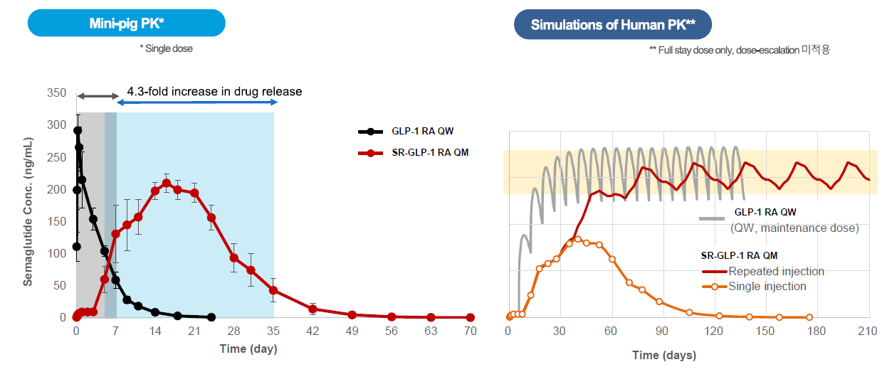 - 주1회 주사제의 한 달 투약량의 80%만 사용해도 월1회 제형으로 만들 수 있음