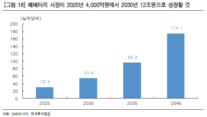 - 폐배터리 시장 규모는 2025년 299억달러에서 2030년 536억달러, 2040년에는 1,741억달러로 빠르게 성장