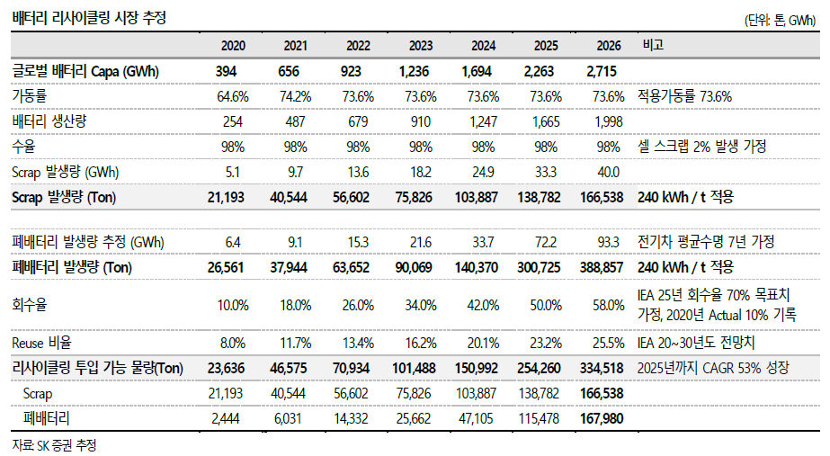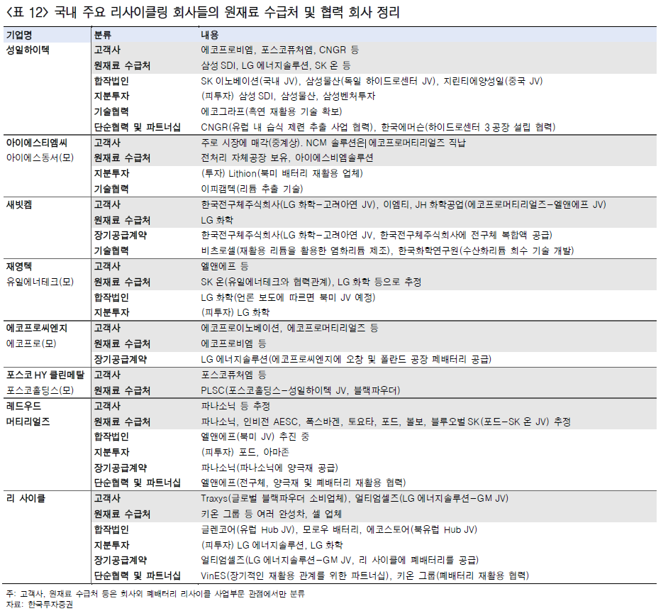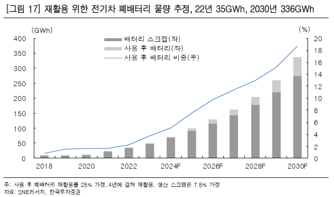 - 18년부터 본격적으로 전기차가 팔리기 시작했기 때문에 25년부터 폐배터리 시장에 의미 있게 원재료로 공급될 것