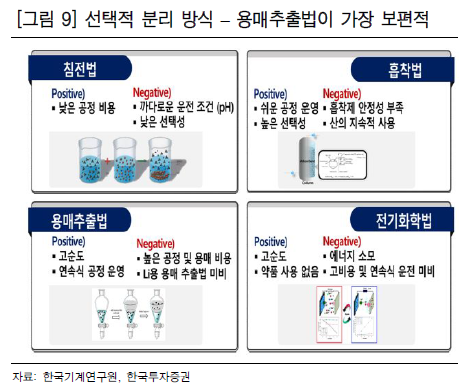 - 코발트, 니켈, 망간, 리튬 등 다양한 금속 회수할 수 있으며, 회수율 높음