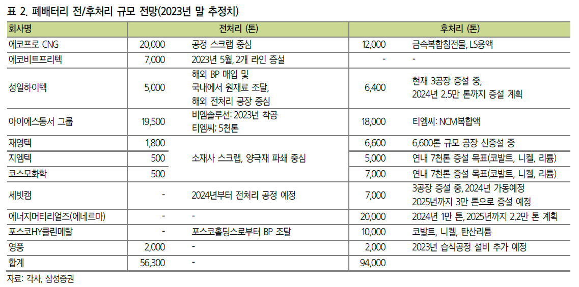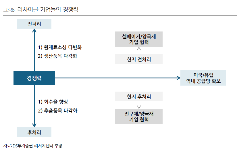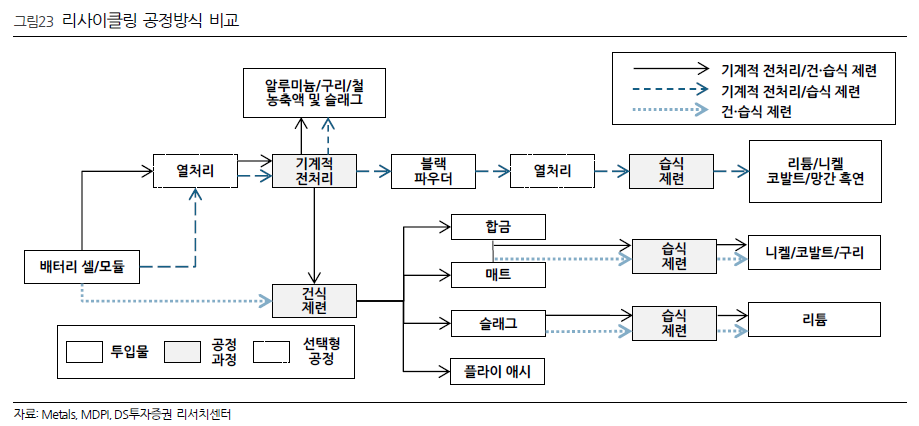 - 전처리 회사는 배터리 파우더(블랙매스/파우더)를 생산해 후처리 회사에 판매