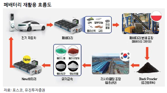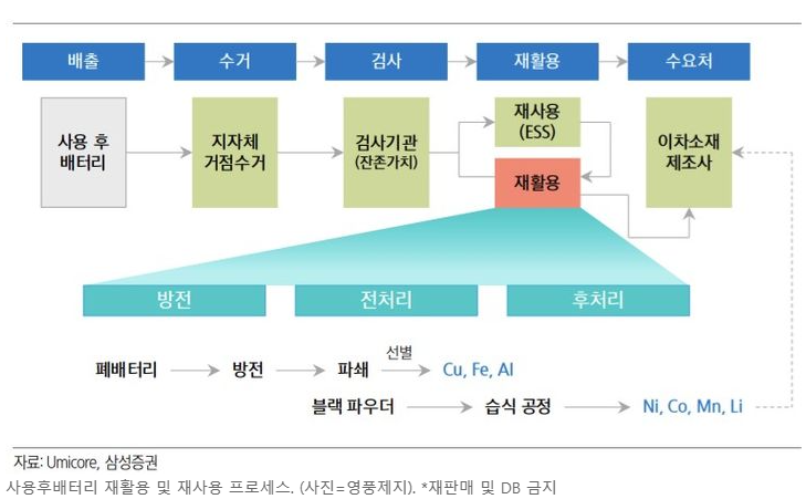 - 보통 양극재에 포함된 니켈, 코발트, 망간 등과 알루미늄, 구리, 플라스틱 등의 배터리 원재료 회수