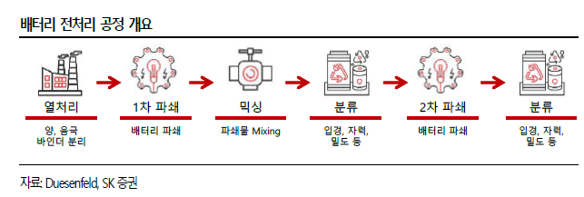 - 전처리는 배터리 방전 후 파쇄해 철, 주석성분, 알루미늄 등을 회수하고 블랙파우더(BP, 리튬/니켈/망간 등 혼합가루)와 블랙매스(BM)를 제조하는 과정
