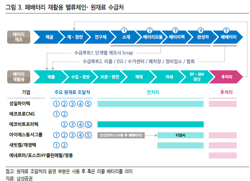- 셀 제조사, 양극재 회사, 사용후 배터리 수집처는 전처리 회사에 폐배터리 판매