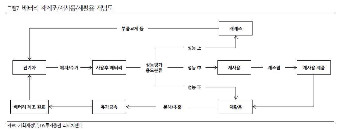 - 배터리의 상태에 따라서 재활용, 재사용으로 구분 할 수 있음