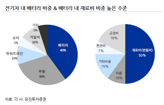 - 전기차 원가에서 배터리가 차지하는 비중은 30~50%