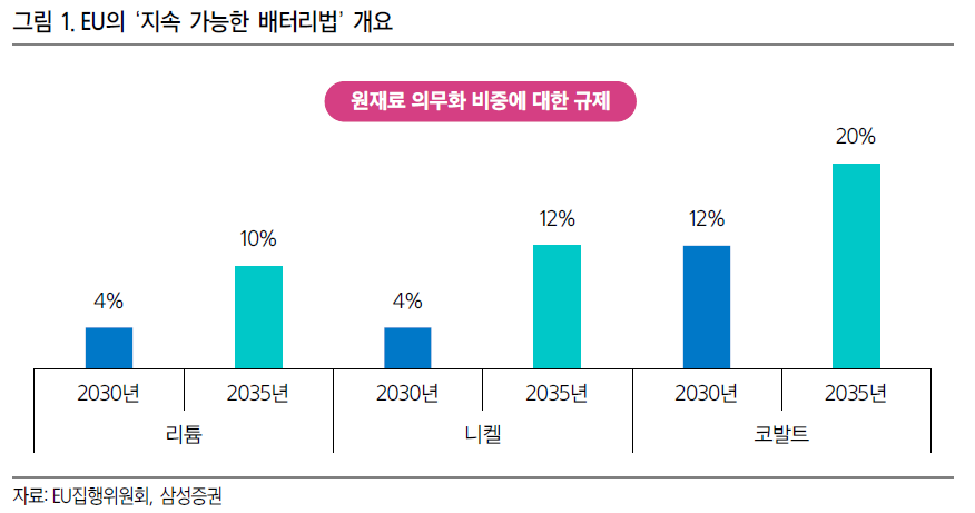 - 30년 1월부터 배터리 사용 코발트는12%, 리튬 4%,니켈 4% 등 반드시 재활용 원료를 써야함