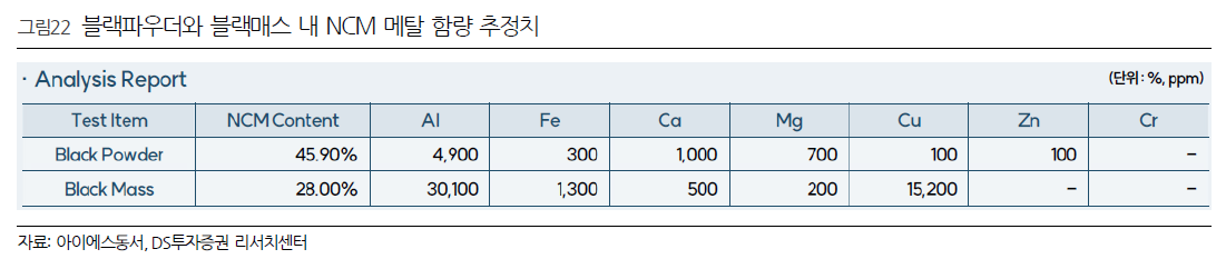 - 알루미늄, 구리 등이 분리되며 폐배터리 전처리 생산물인 블랙 파우더가 생산