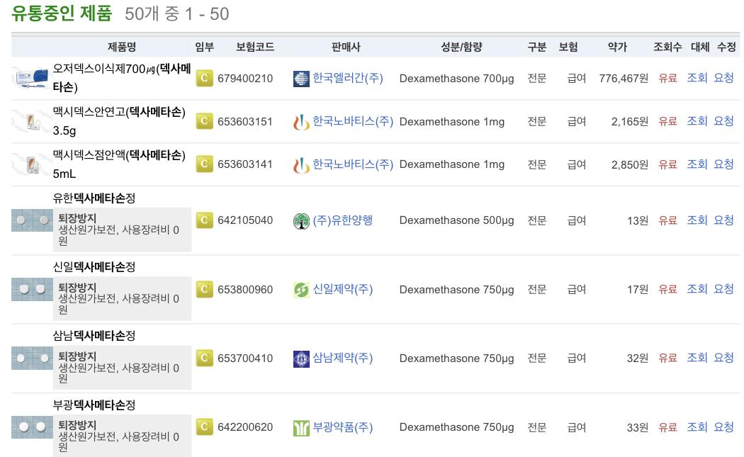 드러그인포에서 덱사메타손을 검색해보면 관련 회사는 다음과 같다.