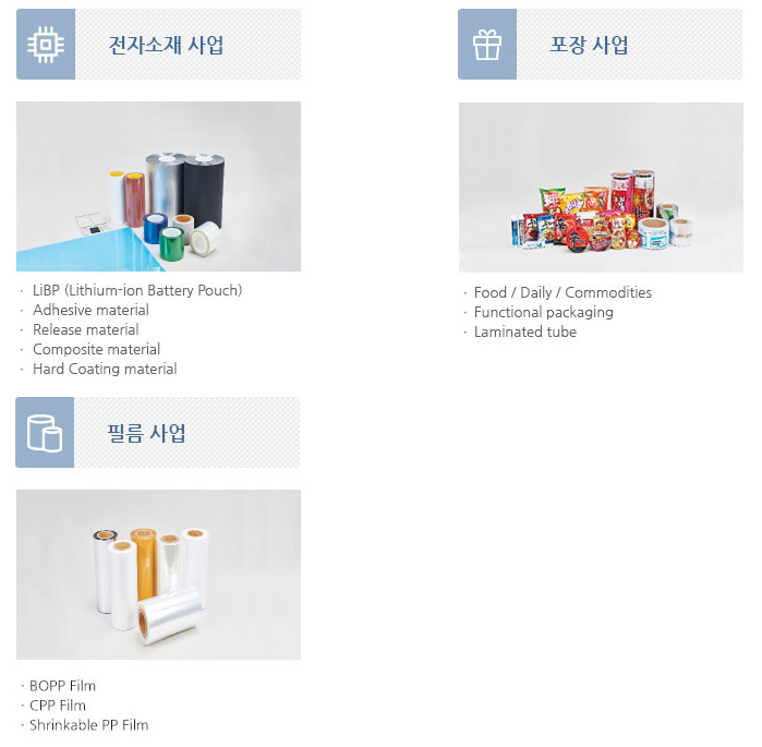 - Polypropylene 및 Pet Film 등을 가공한 필름 형태를 기반으로 전자소재 부품, 플라스틱 필름 및 포장제 제조