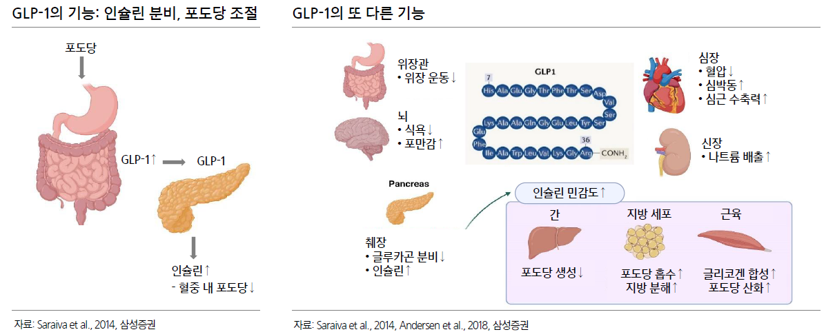 - GLP-1은 식후 혈당 조절뿐만 아니라 위 배출을 지연시키고 뇌의 식욕 조절 중추 작용을 통해 포만감을 유도