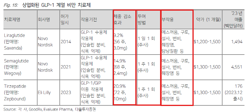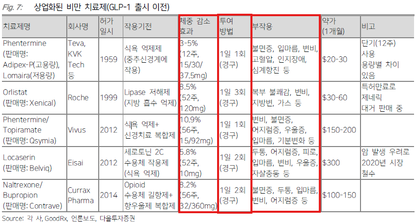 - 과거 비만 치료제는 모두 경구형이며 체중 감소 효과는 최대 10%, 부작용도 심했음