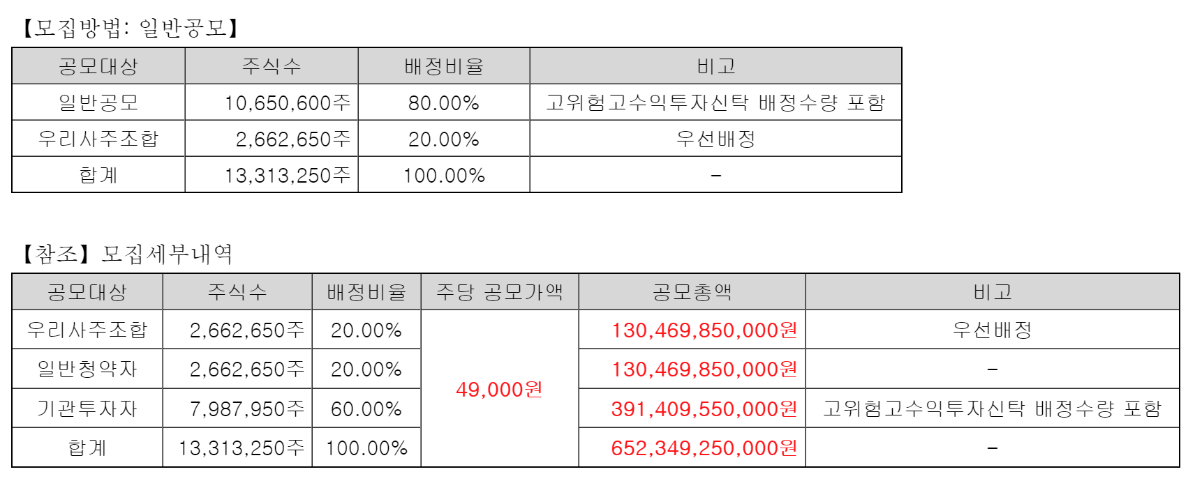일반공모는 전체 중 80%이며 그 중 20%는 일반청약자에게 할당된다.