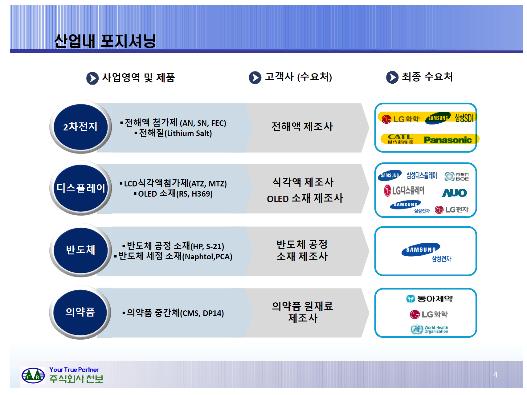 천보는 기존의 디스플레이 및 반도체 소재기업에서 이제는 2차전지 소개기업으로 자신을 소개하고 있다. 새로운 시장의 변화에 맞추어 천보도 탈바꿈하는 것이다.