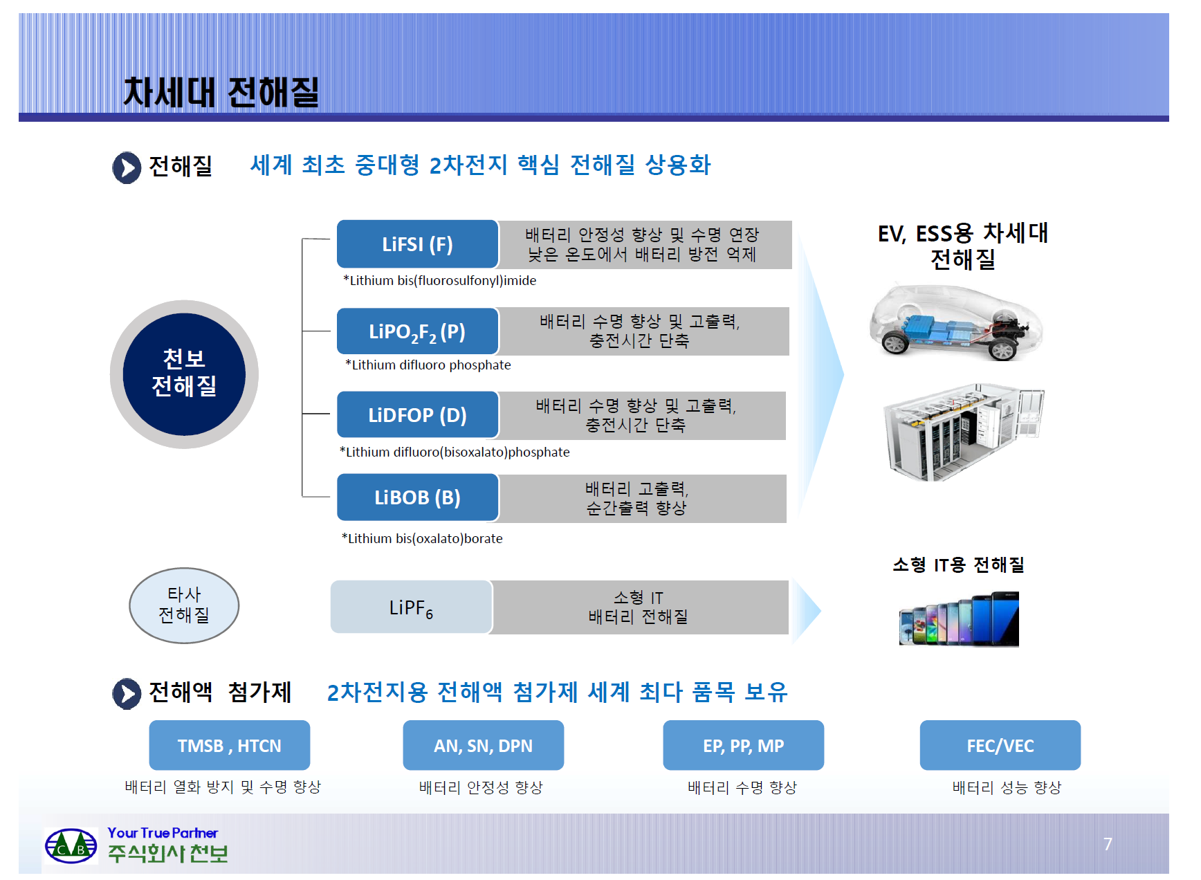 천보의 2차전지 소재에 대한 설명이다. 세계최초란 타이틀에서 알 수 있듯이 천보의 기술력은 뛰어나다.