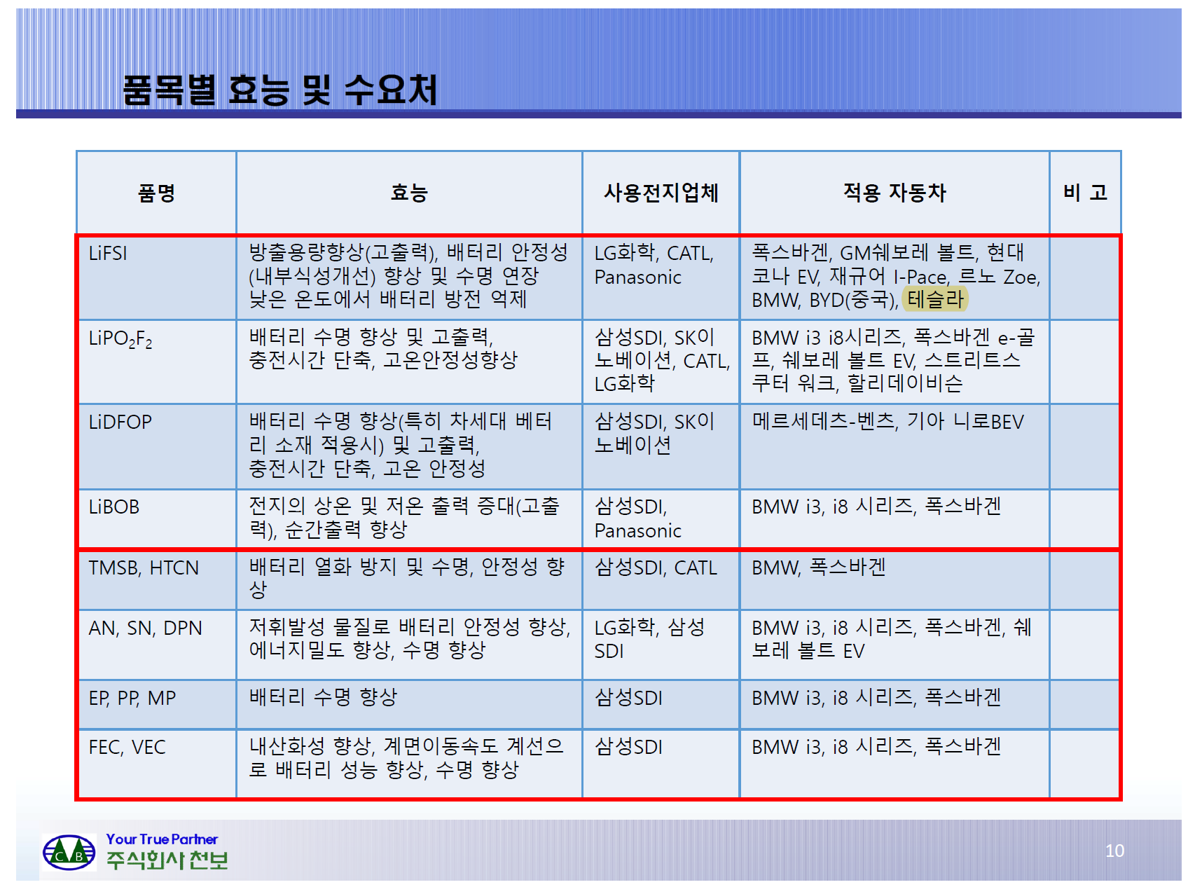 천보가 개발한 차세대 전해질이 글로벌 탑5 2차전지업체에 공급된다. 그렇기에 전기차 시장의 선두주자인 테슬라에도 천보의 전해질이 들어가는 것이다. 테슬라가 성장해도 천보는 이익, 반테슬라 연합인 기존 자동차 업체들이 선전해도 천보는 이익이다.