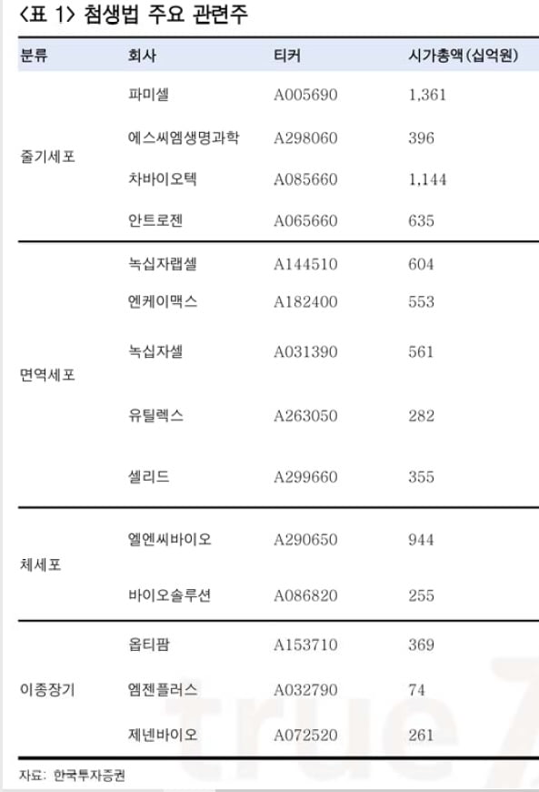 한국투자증권은 28일부터 시행되는 ‘첨단재생바이오약법(첨생법)’ 관련 주식에 대해 관심을 가질 것을 권고했다.