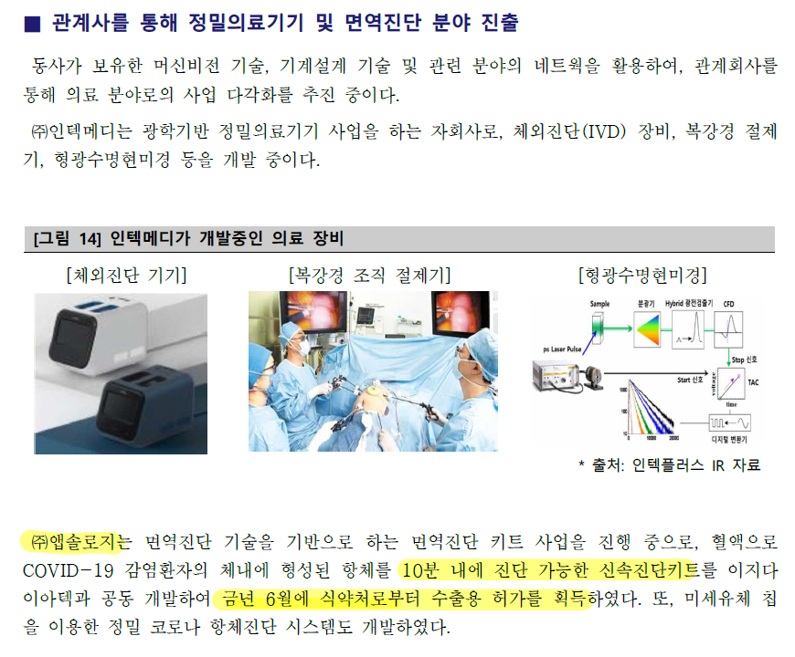 세번쨰는 자회사인 앱솔로지의 진단키트 사업이다. 혈액을 통해 10분만에 코로나 감염여부를 판단할 수 있는 신속진단키트가 현재 미국 FDA 긴급사용승인 대기 중이고, 승인나는 즉시 공급하는 계약을 체결한 상황이다.
