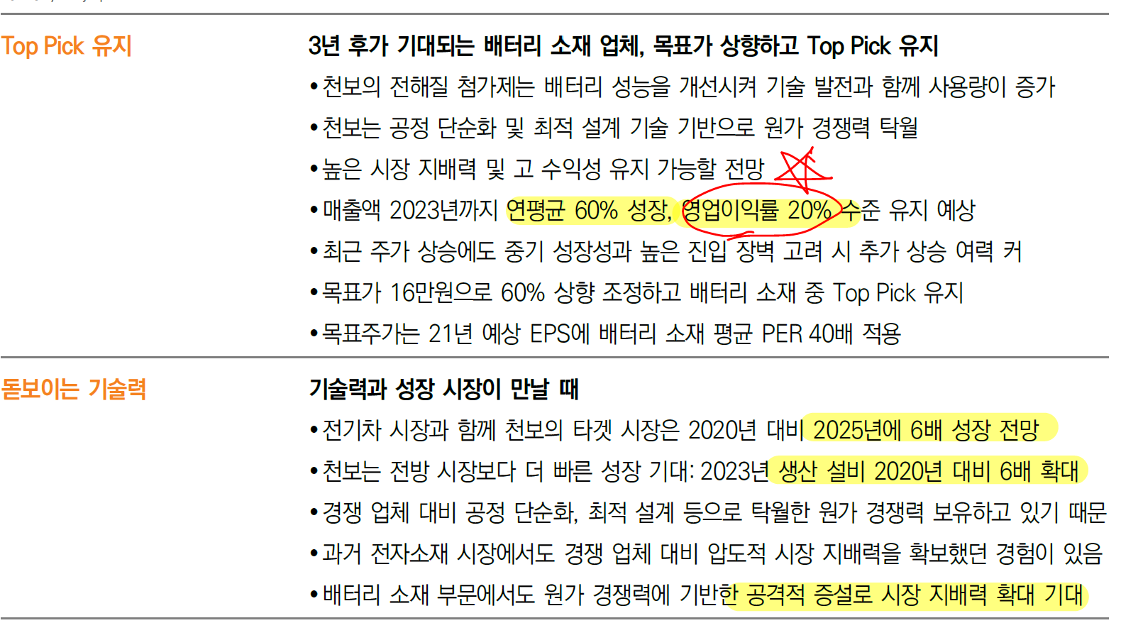 천보는 앞으로 3년 동안 매출액이 매년 60%씩 성장한다고 예상하고 있다. 매출액의 급속한 성정에도 불구하고 영업이익률은 여전히 20%를 유지한다. 2차전지 소재업체 중에서도 영업이익률 20%는 천보가 유일하다.