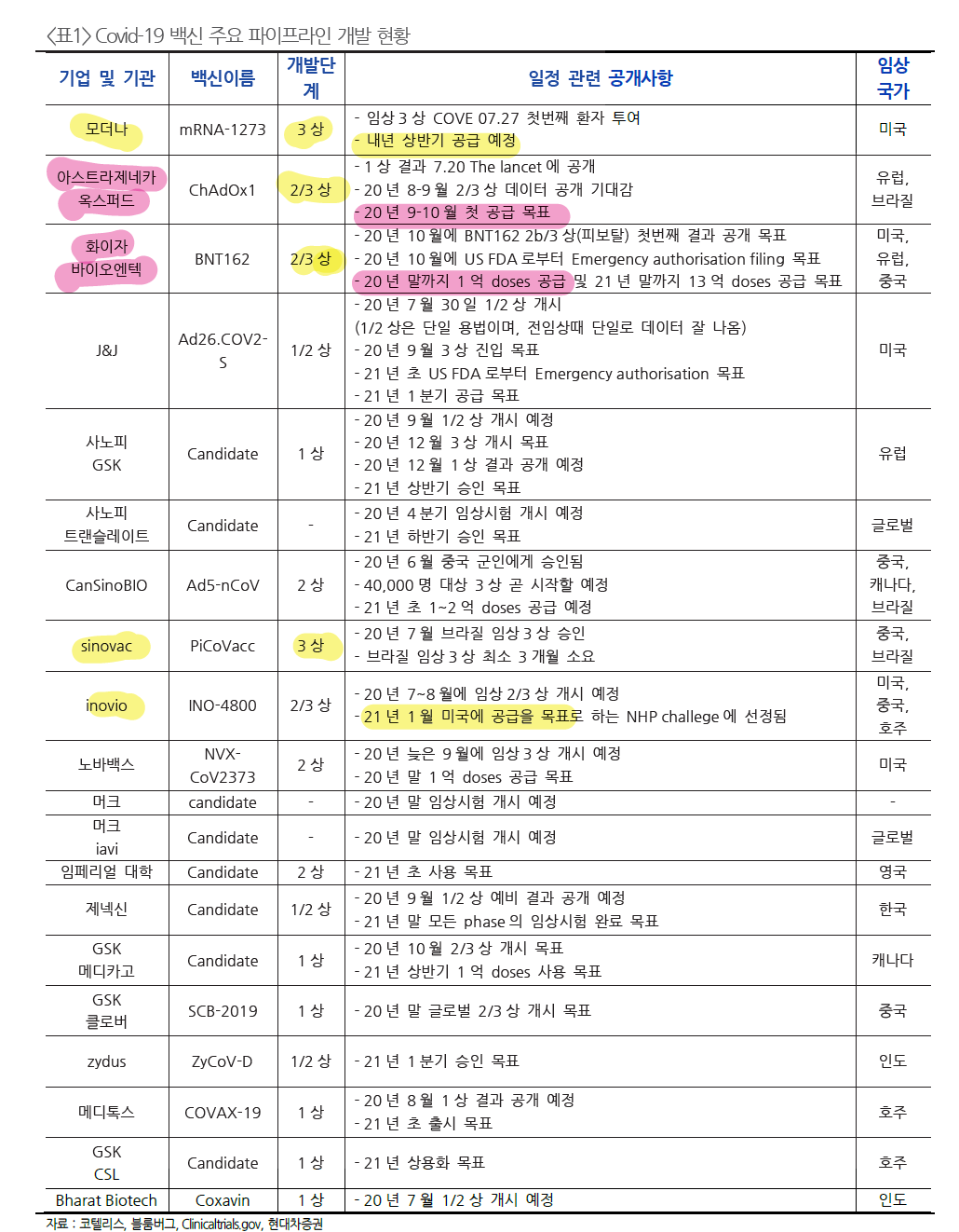 현대차증권에서 코로나 백신 개발 현황에 대해서 잘 정리된 리포트가 나왔다.