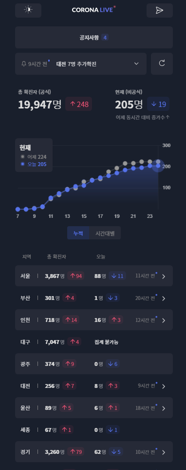 공식집계는 매일 10시에서 10시30분 사이에 질본에서 발표한다. 그런데 주식을 하는 사람들이라면 그 전에 미리 알고 싶어한다. 코로나 확진자수의 동향에 따라 투자포트를 어떻게 구성할지에 대해 미리 정해야 되기 때문이다. 물론 단타용 포트에 한해서다.