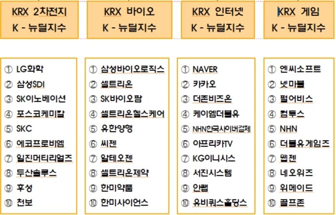 한국거래서에서 한국판 뉴딜 사업 BBIG(배터리·바이오·인터넷·게임) 관련 종목으로 구성된 'K-뉴딜주가지수' 5종을 오는 7일 발표한다고 한다.