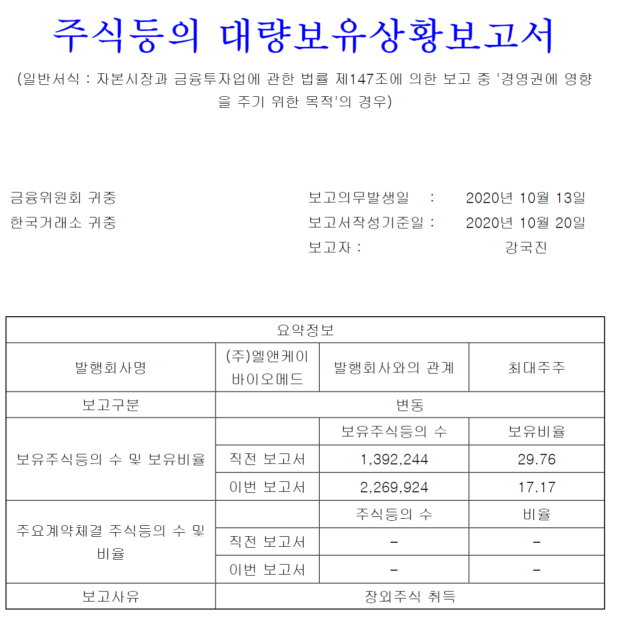 엘앤케이바이오의 강국진 회장의 지분율이 15.70%에서 16.83%으로 올라갔다. 그 사유는 10월 13일 기존 BRV의 보유 14만8809주를 주당 2만3520원에 사들였기 때문이다. 강국진 회장은 거래대금을 마련하기 위해 약 5억원은 사재를 출연했다. 나머지 35억원은 엘앤케이바이오로부터 차입했다.