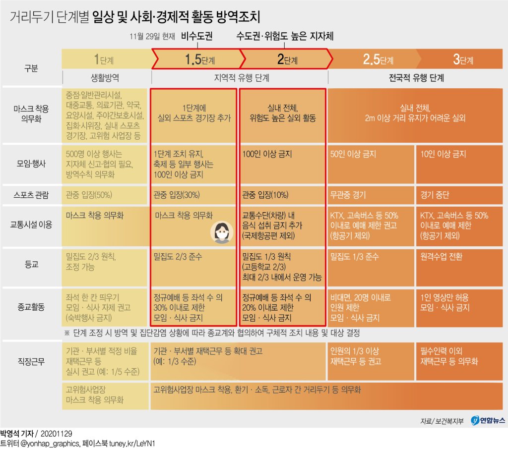 전국 1.5단계 격상·부산 등 5곳 2단계 추진…수도권은 2단계+α(종합), 신선미기자, 사회뉴스 (송고시간 2020-11-29 17:04)