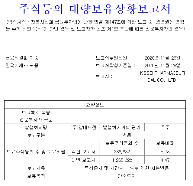 지난 12월 3일 알테오젠의 주식등의 대량보유상황보고서 공시가 나왔다.