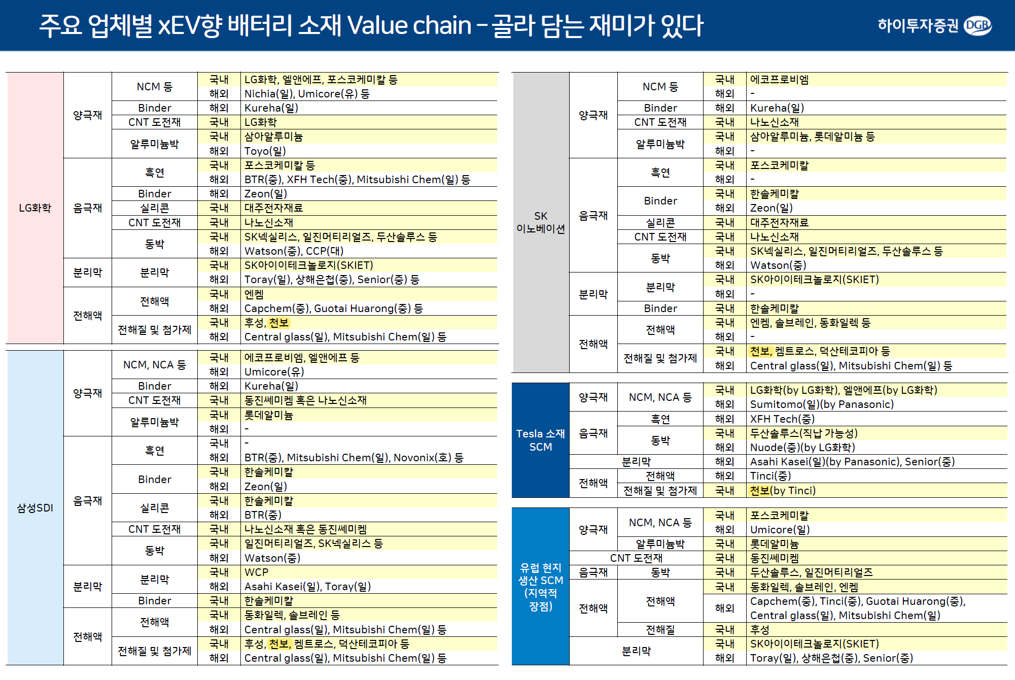 아래 국내 3사 및 테슬라, 유럽생산기지의 공급망을 보면 천보는 유럽현지공장을 제외하고는 국내3사 및 테슬라모델 전부에 전해질 및 첨가제를 납품한다.
