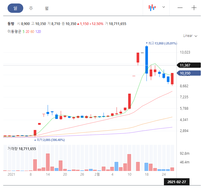쿠팡 상장 관련주인 동방의 차트를 보면 최고점을 찍고 하락세를 이어오다가 오늘 5일선을 넘었다. 그리고 11300원대의 저항선을 뚫는다면 다시 한번 랠리를 시작할 것으로 보인다.