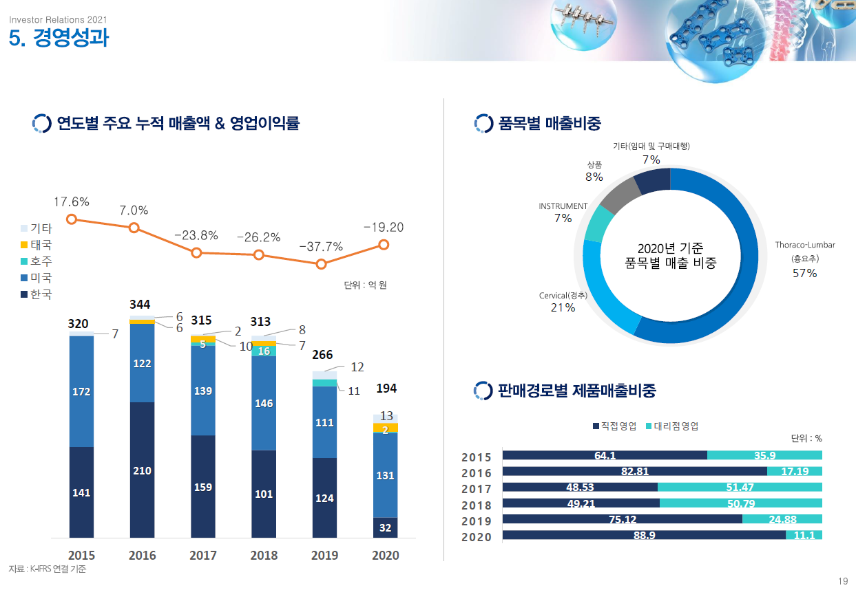 품목별 매출 비중도 흉요추 제품군의 비중이 2019년대비 20% 늘어난 전체의 57%를 차지하는 것이 눈에 띈다. 주요 제품의 판매가 매출증대의 주요원인이었다는 점이 고무적이다.