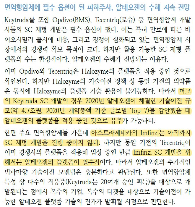 다시 리포트를 보면 하이브로자임 기술의 추가 라이센싱아웃 후보자로 아스트라제네카를 언급하고 있다. 그 이유는 아스트라제네카의 의약품인 Imfinzi의 경쟁약물인 로슈의 Tecentriq는 할로자임의 인헨스 기술을 사용하여 SC제형을 개발 중이기 때문이다. 경쟁사가 하고 있는데 가만히 있을 수는 없고 할로자임은 동일 기전에 대해서는 독점계약만 가능하니 아스트라제네카의 선택권은 알테오젠 밖에 없다.