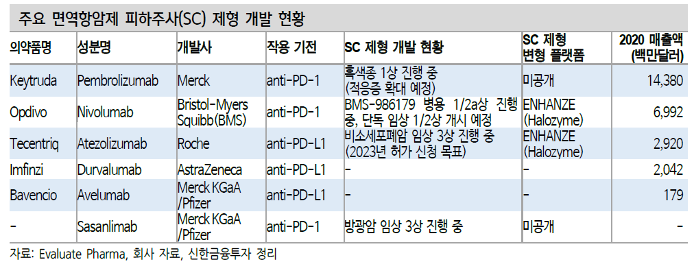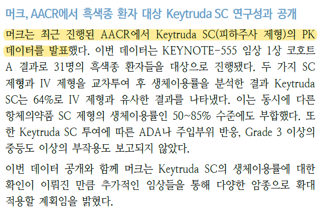 이번 리포트에서는 AACR에서 머크가 키트루다 SC 연구성과를 공개한 것을 바탕으로 SC제형 기술이 전세계에서 할로자임과 알테오젠 밖에 없기 때문에 머크가 두번째 계약 대상자로 유추 가능하다고 설명하고 있다.