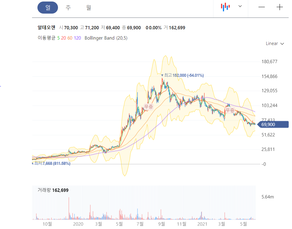 알테오젠의 주가는 지난 9월 최고점 이후 54% 빠졌다. 조정도 이리 큰 조정이 없다.