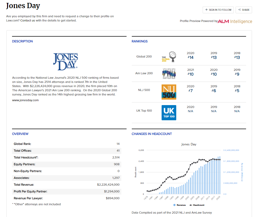 Jones Day는 2514 명의 변호사를 보유하고 있으며 미국에서 7위다. 2020년 총 매출 2,226,424,000 달러로 The American Lawyer의 2021 Am Law 200 순위에서 10위를 차지했다. 2020 Global 200 설문 조사에서 Jones Day는 세계에서 14번째로 높은 수익을 올린 로펌으로 선정되었다.