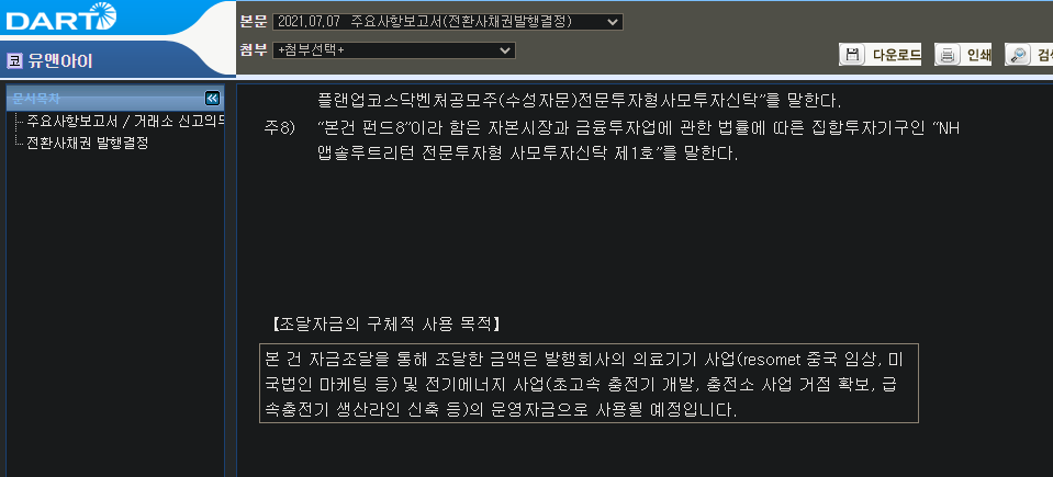 바로 조달자금의 구체적 사용 목적이다. 최초 게재는 "본 건 자금조달을 통해 조달한 금액은 발행회사의 의료기기 사업(resomet 중국 임상, 미국법인 마케팅 등) 및 전기에너지 사업(초고속 충전기 개발, 충전소 사업 거점 확보, 급속충전기 생산라인 신축 등)의 운영자금으로 사용될 예정입니다"라고 했다.