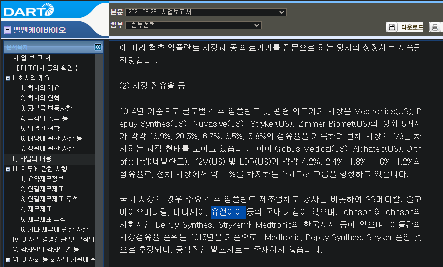 엘앤케이바이오의 사업보고서를 보면 국내에서 척추임플란트 사업을 하는 경쟁업체다.
