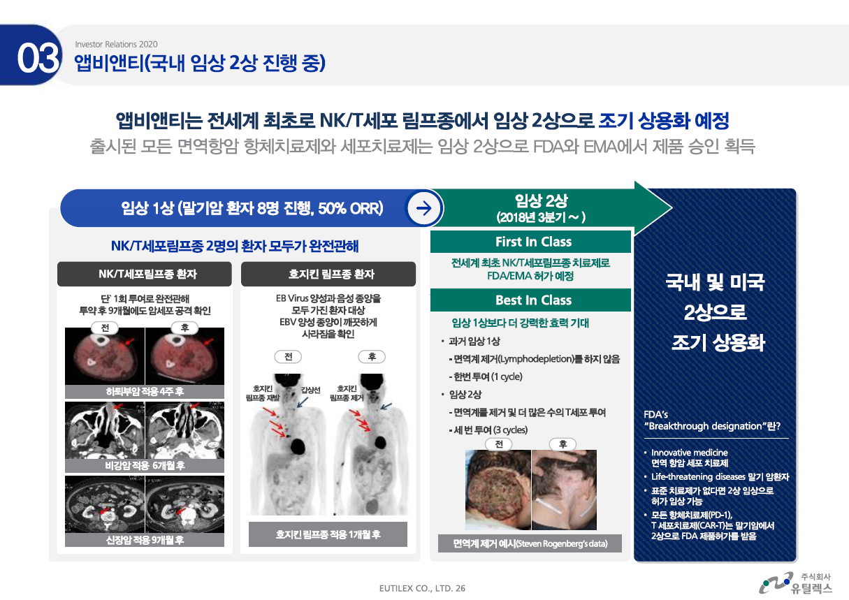 기존 승인된 앱비앤티셀의 1/2a 임상시험은 종료된 1상 임상시험에서 완전관해 효력을 보인 NK/T cell 림프종이 대상이었는데, 이번에 추가 신청한 앱비앤티셀 임상은 위암 및 식도선암 등의 고형암을 대상으로 한다.