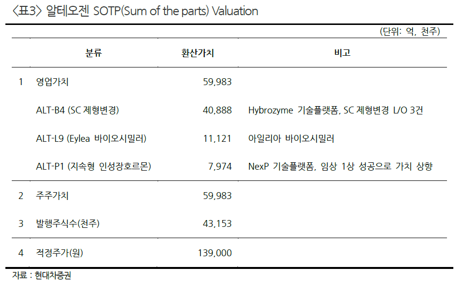 현대차증권의 이번 리포트에서 알테오젠의 TP는 지난달과 동일하게 139,000원이다. ALT-P7의 가치는 전혀 계산되지 않았다. ALT-P7의 가치를 고려한다면 TP는 20만원 언저리가 되어야 한다.