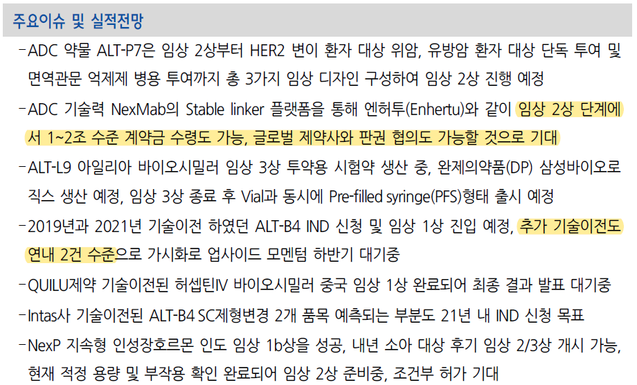 그리고 이번 리포트에서 지난달과 달리 ALT-B4 과거 기술수출건에 대한 코멘트를 보면, 2020년은 빠져있고 2019년과 2021년이라고 언급되어 있다. 2020년 기술수출 회사가 머크라고 추정하고 있는데 임상에 대한 뭔가 문제가 생긴 것이 아닐까 조심스레 추정해본다. 단순오기라고 하니 이 부분은 무시해도 된다.