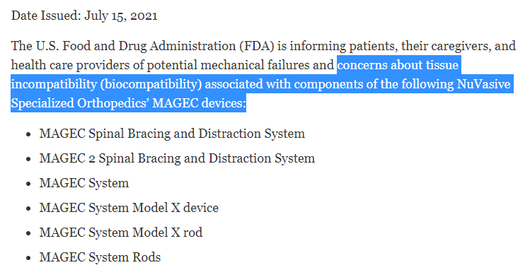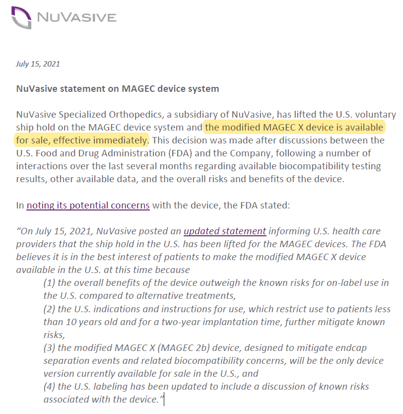 요약하자면, 누베이시브는 생체 적합성 문제로 MAGEC 1.5 및 2 척추측만증 의료 기기의 미국 판매를 영구적으로 중단하지만, 이 문제를 해결한 MAGEC X제품을 시장에 출시했다.