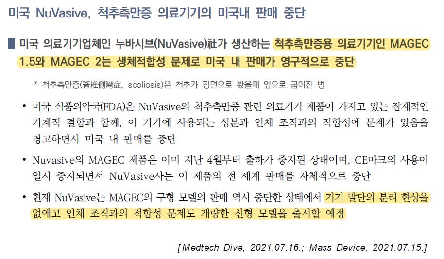 실제 MAGEC는 CE승인이 일시적으로 중단됨으로 인해 4월부터 누베이시브가 자발적으로 글로벌 판매를 중단했었다. 그리고 미국FDA가 안정성 문제를 지적하자 누베이시브의 MAGEC 제품 판매는 중단되었다.
