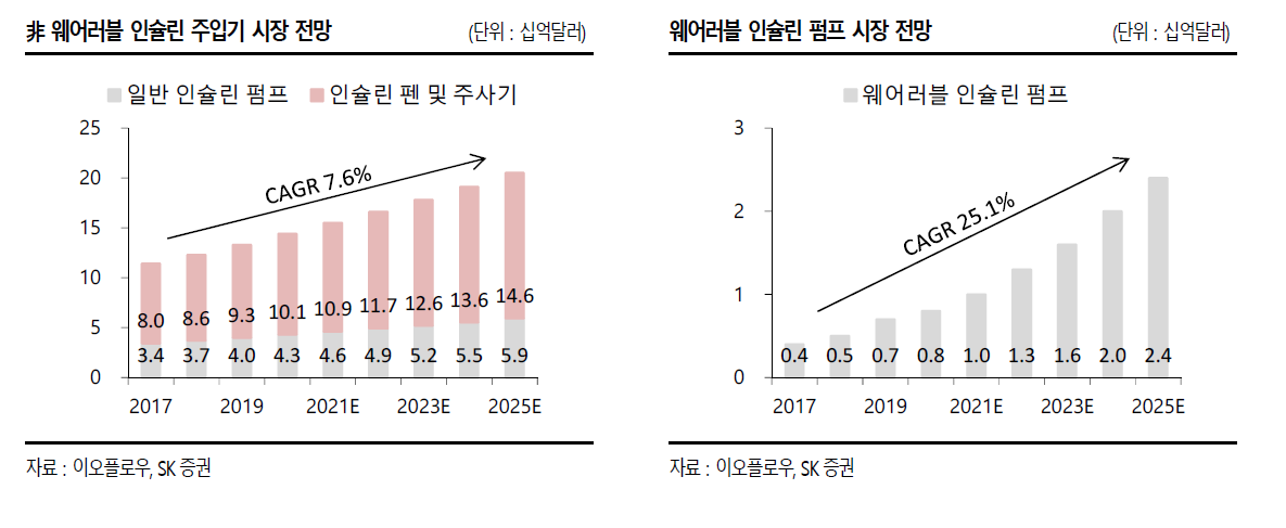 기존 주입기는 수동으로 사람이 직접 주사기 형태로 인슐린을 주입하는 방식인데 이 시장도 꾸준히 커지고 있다. 하지만 웨어러블 인슐린 펌프가 기존 주입기 시장으로 빠르게 침투하여 점유율을 빠르게 높이고 있다.