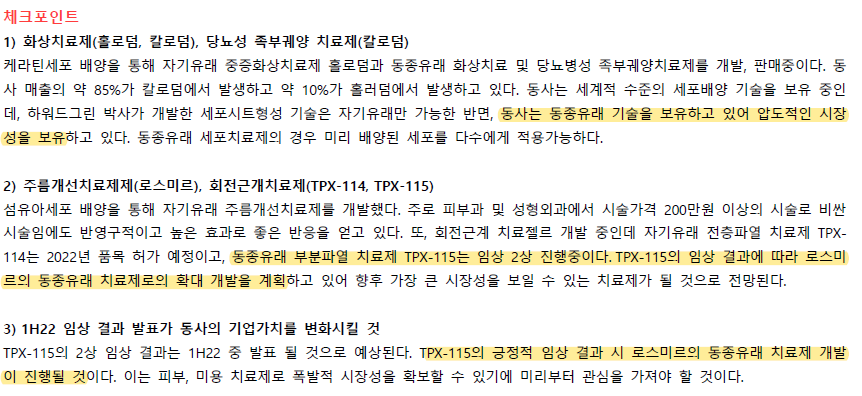 TPX-114는 자가유래로, 국내 임상3상이 진행중이며 2022년 상반기에 임상결과가 나온다. 결과가 좋으면 2023년에 상용화된다.
