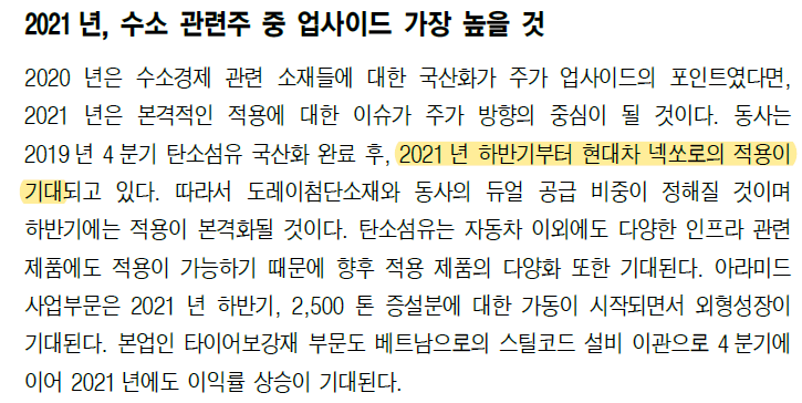 올해 초에 넥쏘로 공급이 기대된다고 하나 최근 기사를 보면 넥쏘는 여전히 도레이첨단소재의 탄소섬유를 사용한 일진하이솔루스의 수소연료탱크를 독점 계약했다.
