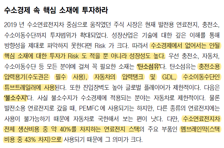 2차전지 소재주의 폭발을 보면서 성장산업에서의 소재주의 위력을 느꼈다. 이제는 수소시대에 대비해 수소소재에 대해서 관심을 가져야 한다.