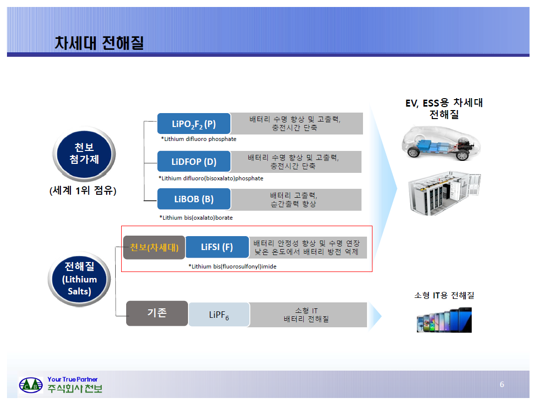 천보는 전해질염과 전해액 첨가제를 생산하는 기업이다. 천보가 최근에 새만금에 공장을 지어서 생산량을 늘리겠다고 한 것은 차세대 전해질인 LiFSi로 일명 F전해질이다. F전해질은 배터리 안정성과 수명 등에서 기존의 P전해질보다 뛰어나서 여러 셀업체에서 공급요청이 많아지고 있다.