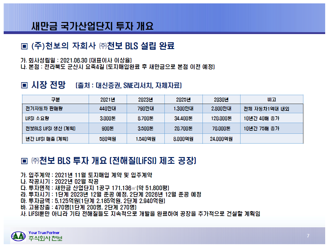 F전해질의 생산량은 현재 900톤 규모에서 2030년에는 거의 75배나 많은 7만톤을 생산하려고 한다. 그에 따라 매출은 2021년 580억에서 2030년에는 2조4000억원을 예상하고 있다. 천보는 대량생산을 통해 규모의 경제를 달성하려고 한다. F전해질 시장의 70%를 먹겠다는 것이다. 그렇기 때문에 새만금에 대량 증설을 계획하고 있다.